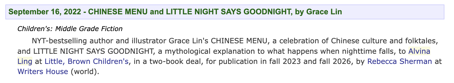 Grace announces the project she has been working on with Alvina!: Chinese Menu, a celebration of Chinese culture and folktales coming out in Fall of 2023! The book will tell the myths and stories about American Chinese food menu items.