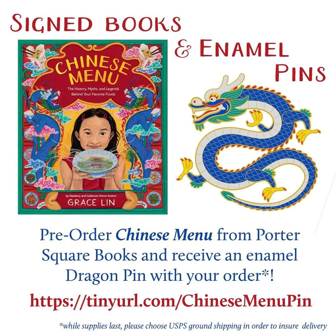 I just wanted to remind everyone that you can get also free virtual classroom visit with me if you pre-order from the The Eric Carle Museum of Picture Book Art. The virtual visit will be on and about the Moon Festival in Sept—so lots of possible curriculum tie-ins! If you pre-order “Chinese Menu” from Porter Square Books , you will receive this enamel pin with your autographed book. Perfect for this upcoming year of the dragon—make sure you get your order in! Exclusive for pre-orders and only while supplies last.